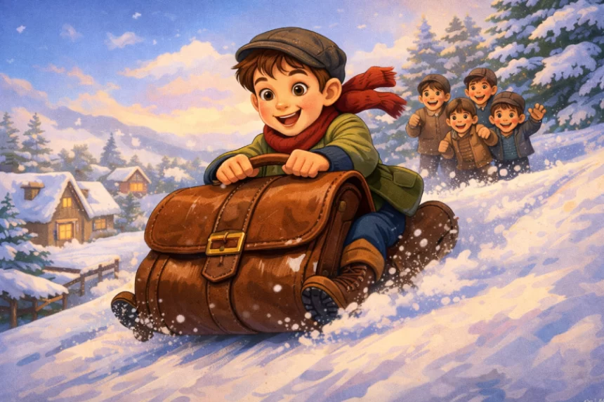 Дечаци су гађали моју торбу грудвама, говорећи да је тако проверавају, да испитују њену чаробну моћ. Ако је чаробна, не могу је погодити. Брзо смо и ја и торба били изгрудвани. Кад смо стигли до брда на излазу из града, сео сам на своју торбу и, држећи се за ручку, спустио се на њој као на санкама низ брдо.