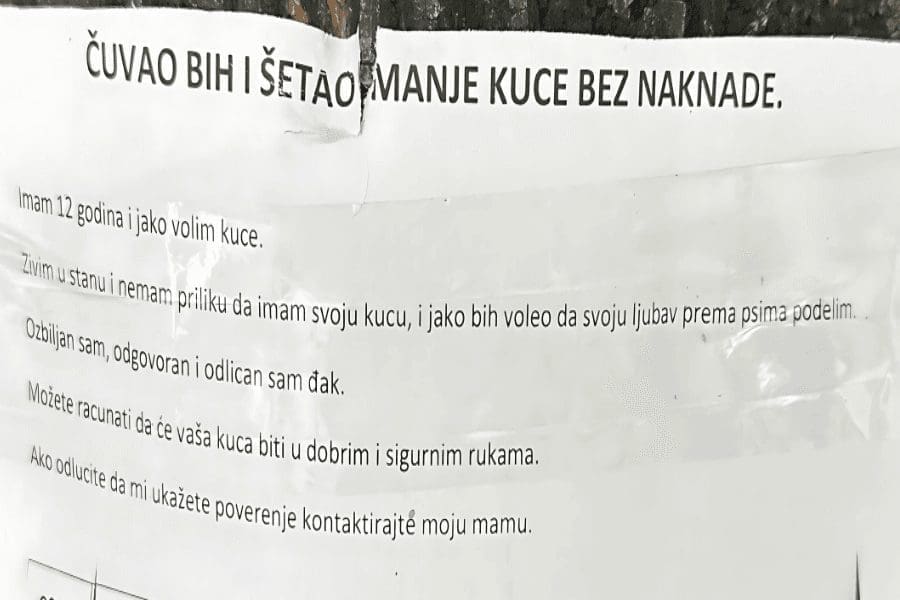 „Имам 12 година и јако волим куце. Живим у стану и немам прилику да имам своју куцу, а јако бих волео да своју љубав према псима поделим. Озбиљан сам, одговоран и одличан сам ђак. Можете рачунати да ће ваша куца бити у добрим и сигурним рукама. Ако одлучите да ми укажете поверење, контактирајте моју маму“ – написано је на папиру залепљеном за дрво.