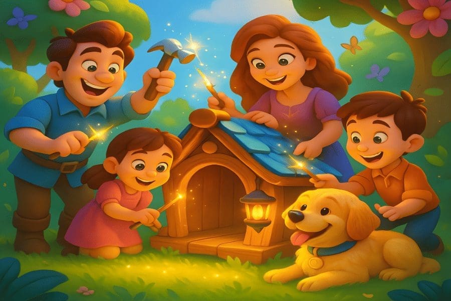 „Добро, добро, сине. Сад прво ручак, онда идемо до чике доктора за животиње, а после тога, у дворишту правимо кућицу за нашег новог укућана,“ рече тата, спусти кутију на под и узе штене у наручје.
