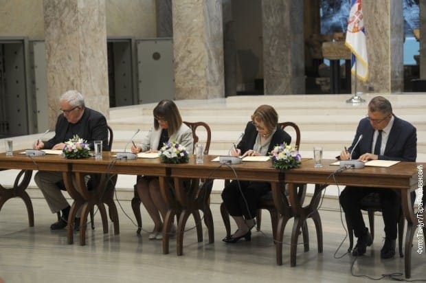 Потпредседница Владе и министарка културе и информисања Маја Гојковић, директорка Народног музеја у Београду Бојана Борић Брешковић, председник Српске академија наука и уметности Владимир С. Костић и в. д. управника Народне библиотеке Србије Владимир Пиштало потписали су споразум.